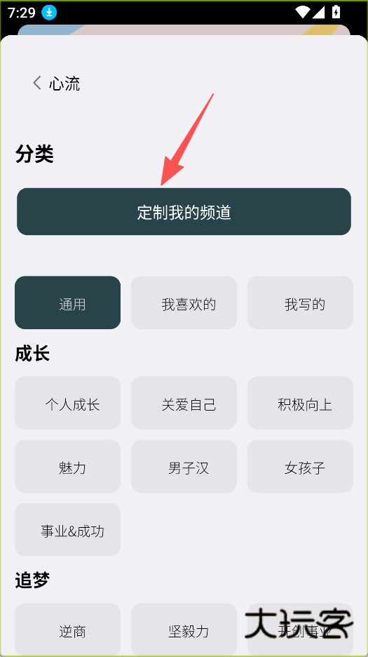 1、点击定制我的频道,可选择通用我喜欢的等分类,以及成长、追梦等领域内容。