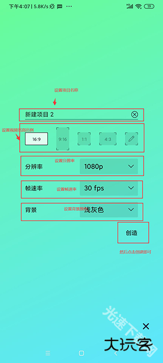 2、然后我们选择创建一个项目,设置项目名称、宽高比例、分辨率、帧速率、背景颜色;