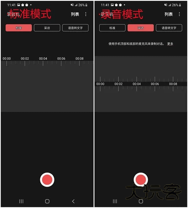 2、标准模式与采访模式,「标准」模式就是大部分手机都在使用的录音模式,而「采访」模式是可以同时调用手机的两个不同位置的麦克风,自己的声音用底部麦克风录制,对方的声音用顶部麦克风录制,这样就可以让采访者与被采访者的声音都非常的清晰,再也不会出现收声忽大忽小的情况啦~
