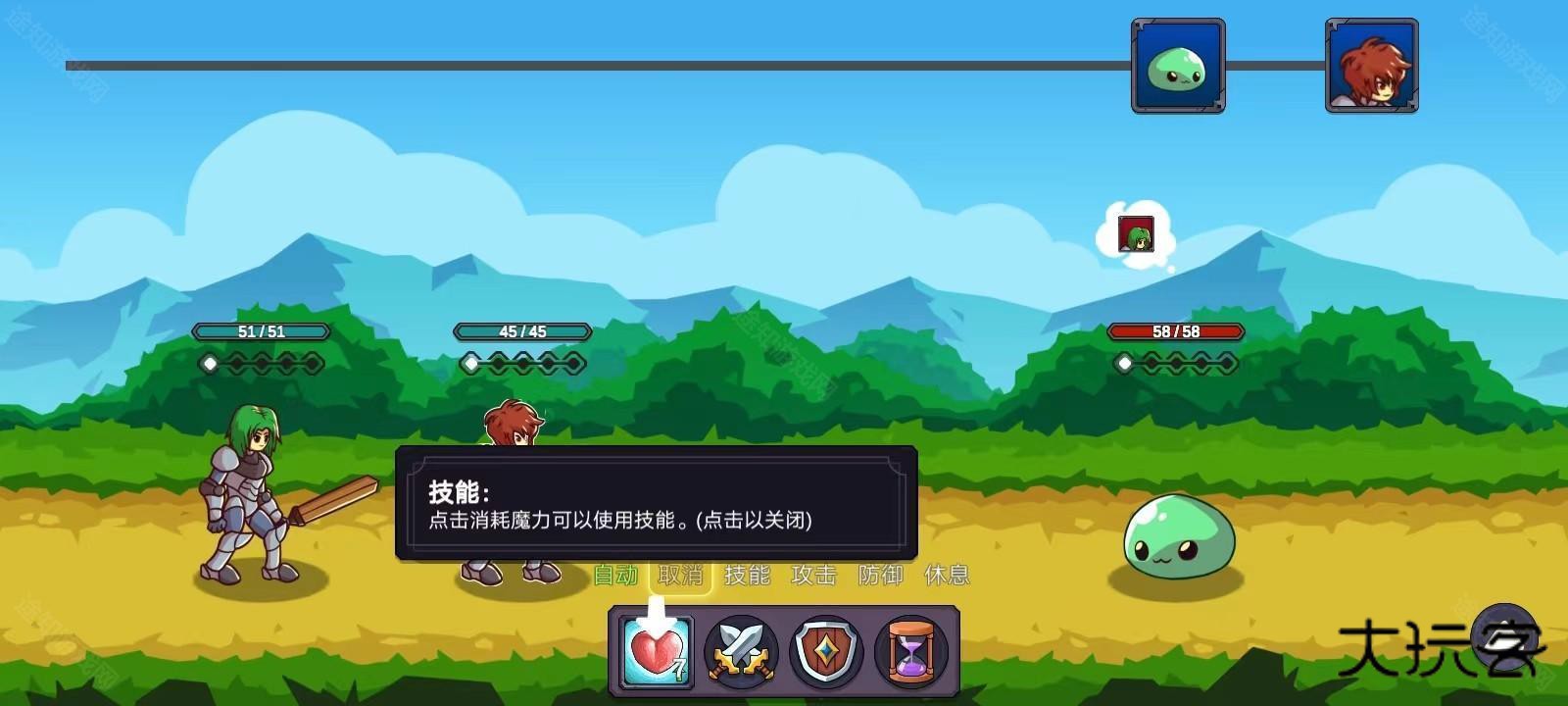 6、最下方的四个按钮分别是技能:点击消耗魔力可以使用技能;攻击:点击即可攻击敌人;防守:点击可以进入防守姿态并获得护甲;休息:点击自己可以结束当前回合并获得一点魔力;