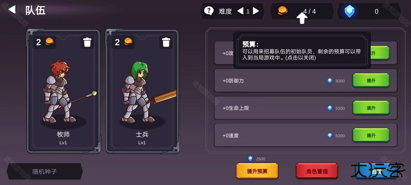 2、然后玩家可以通过预算来招募队伍的初始队员,而剩下的预算可以带入到当局游戏中,在这里也可以进行角色管理,这里会给玩家提供很多的角色,不过有些角色是会要求达到一定的星级才可以解锁,然后点击右下角的【出发】;