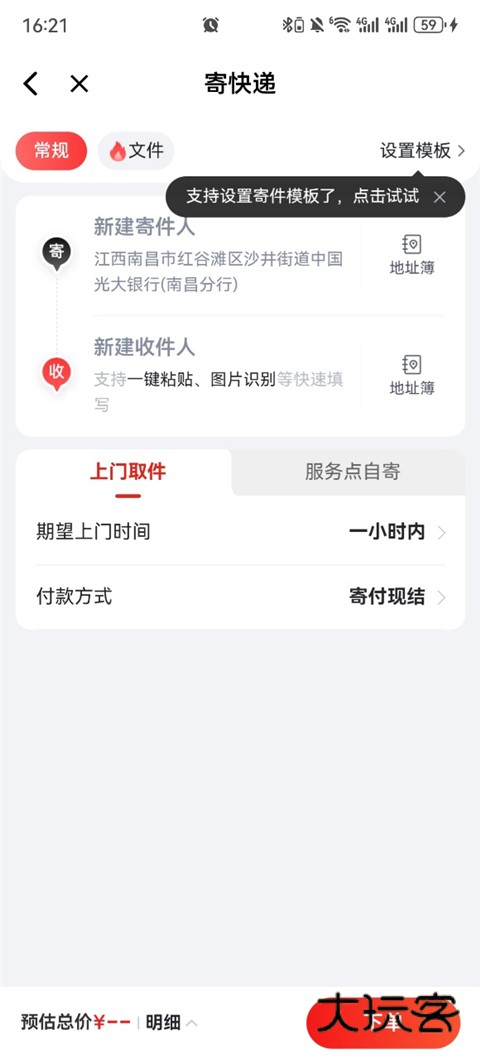 3、输入寄件人收件人形象以及取件时间后下单即可