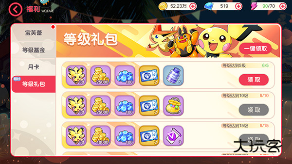 2、等级礼包,达到指定等级即可免费领取礼包。