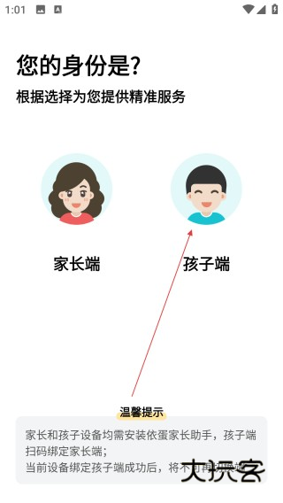 1、进入身份选择页,点击【孩子端】选定使用身份。