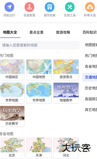1、打开中国地图全图,在发现功能板块中用户可以查询到各省地图、历史地图、各国政区等等地图