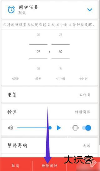 5、在打开的闹钟任务页面,点击底部中间的删除闹钟。如图所示