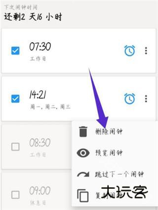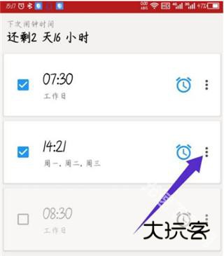 1、打开在本站下载的使命闹钟alarmy,在闹钟主界面,点击闹钟后面的三点图标。如图所示