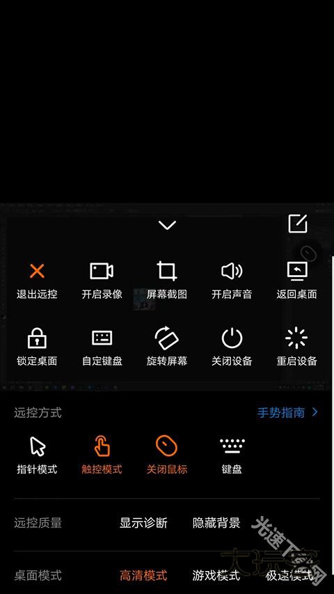 8、选择右下角【箭头】图标,可进行【退出远控】、【开启录像】、【屏幕截图】等快捷操作以及对远控方式、指针模式、远控质量、桌面模式的设置,