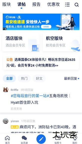2、各种贴子等你来阅读,分为酒店版块和航空版块,提供给你想要的信息公告。