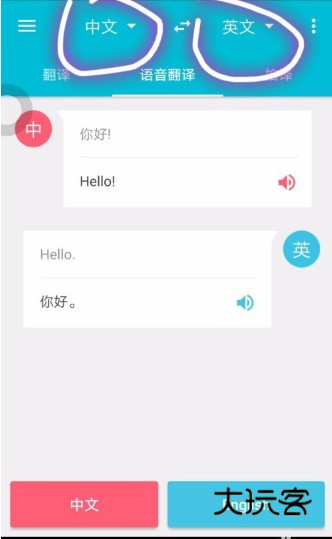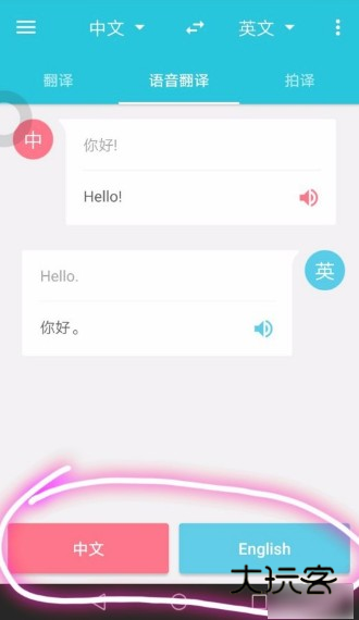 选择后,界面下方显示语言键,例如中文英文互译,就会出现中文,英文,按住中文说一句话,就自动翻译成英文