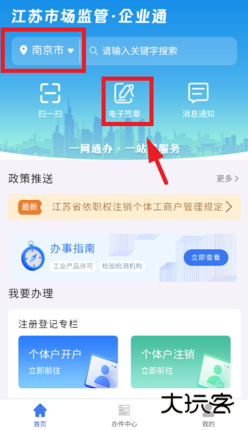 1.点开江苏省市场监管“企业通”进行登录,选择注册地,点击电子签章