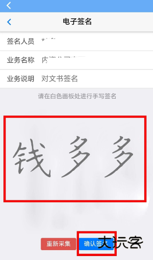 5.请在白色画板处进行手写签名:“一笔一划”写自己的名字,千万不要草写,一定要在签名完成后,再点击“确认签名”,(如不可以手工签名,点击重新采集试试);