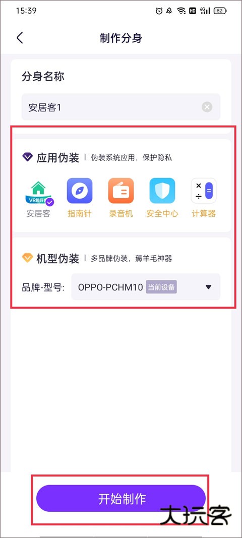 3、输入分身的名称、选择应用伪装还是机型伪装,选好之后点击开始制作就可以了。