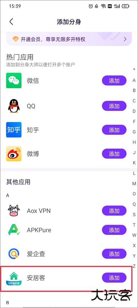 2、选择你想要添加分身的应用程序,并点击右边的添加按钮。