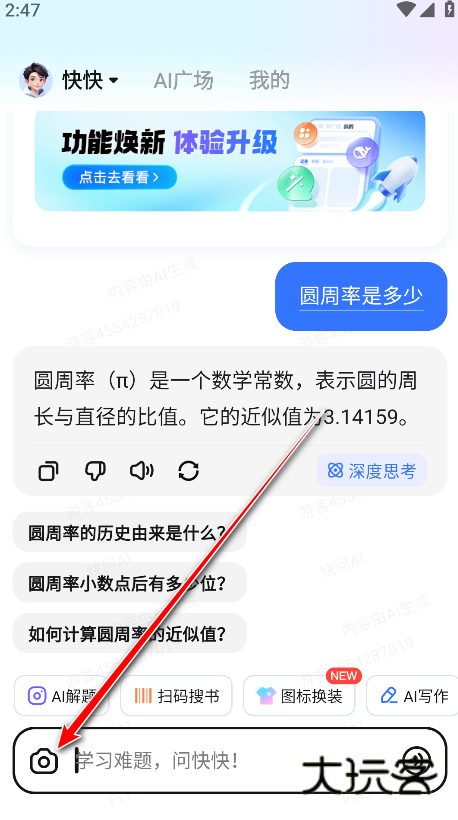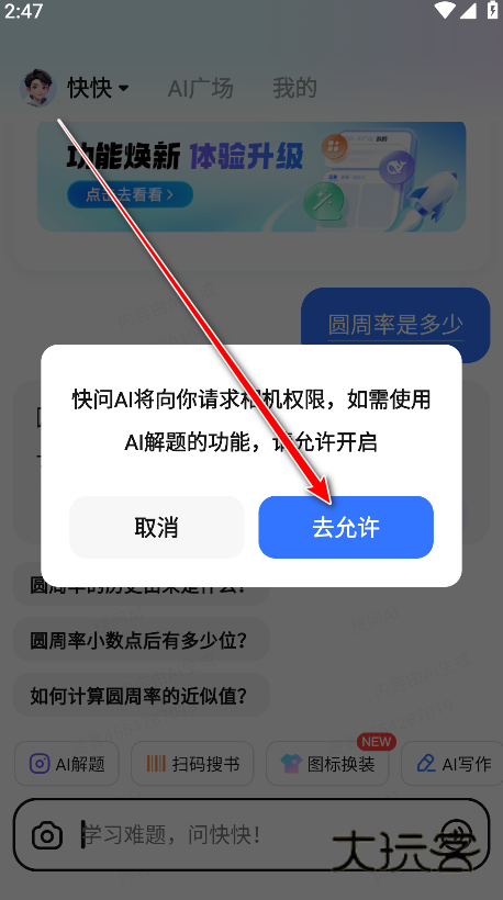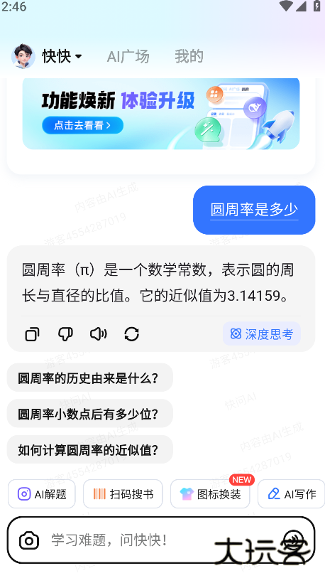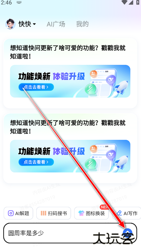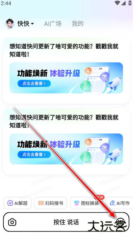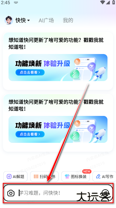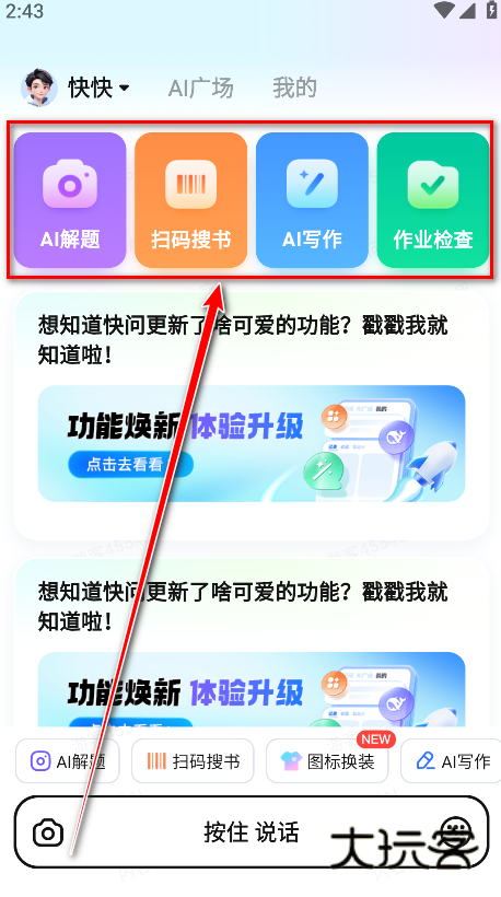 1.打开快问AI,可以看到主页上方有着最新的ai解题、扫码搜书、ai写作、作业检查等等功能。