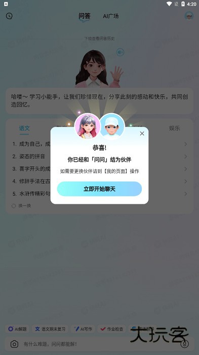 4、恭喜!你已经和「问问」结为伙伴如需要更换伙伴请到【我的页面】操作,点击立即开始聊天按钮。
