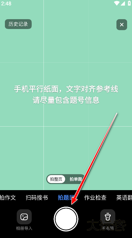 8.将手机平行纸面,文字对齐参考线,请尽量包含题号信息,点击下方的拍照按钮,即可拍题目得到解析了。