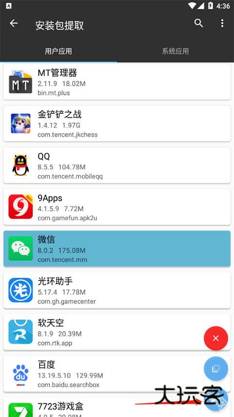 4、长按需要提取的应用,点击右下角底部图标即可提取了。
