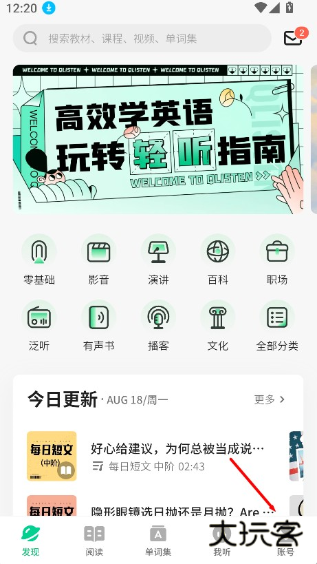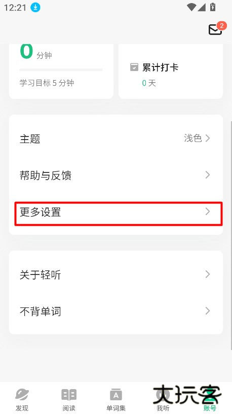 1、进入《轻听英语》APP 首页后,点击右下角账号选项。