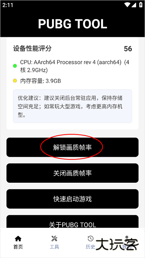 1、手机提前安装好和平精英游戏,下载安装本站提供的画质助手然后打开软件,在首页点击解锁画质帧率;