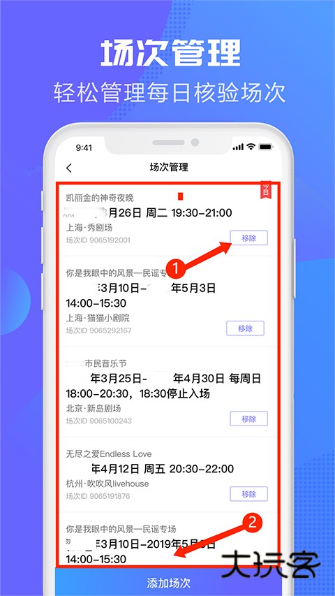 1、进入【场次管理】界面,可根据不同时间安排的场次进行添加或移除专场验票,轻松管理每天的核验场次,