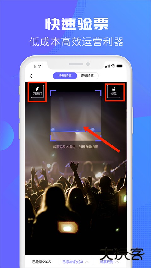 2、进入【快速验票】界面,选择开启闪光灯和锁屏功能,只需将票码放入框中就可以自动扫描验票了,
