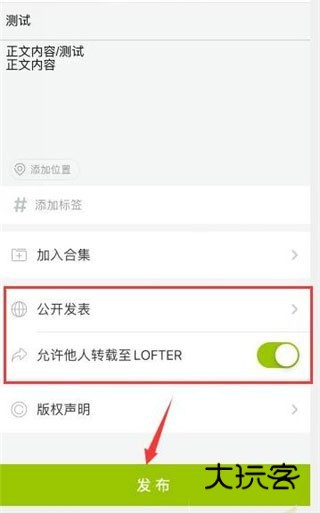 3、可以根据需要,选择是否公开发表以及是否允许他人转载,设置完成后,点击“发布”