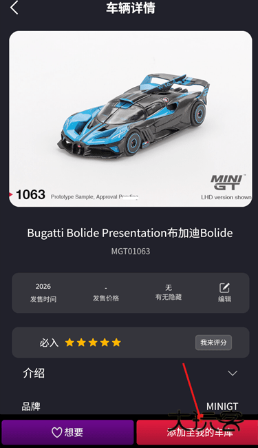 3、进入车辆详情界面后,找到“添加至我的车库”按钮,点击该选项触发收藏功能。