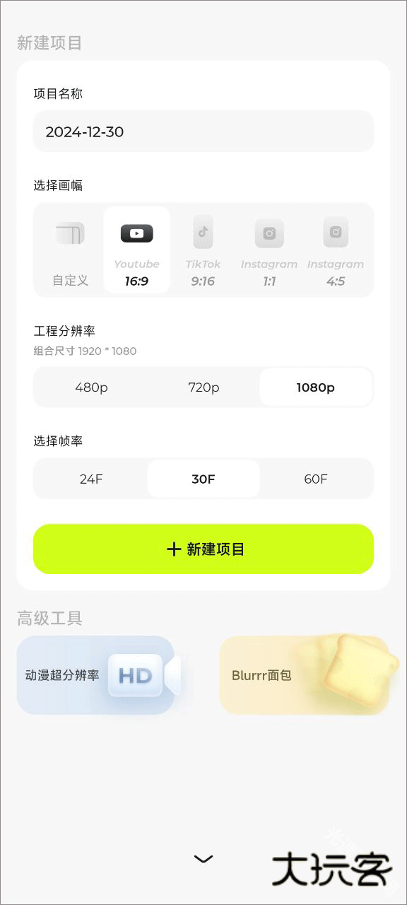 2、选择画幅、工程分辨率、选择帧率等等,之后新建项目;
