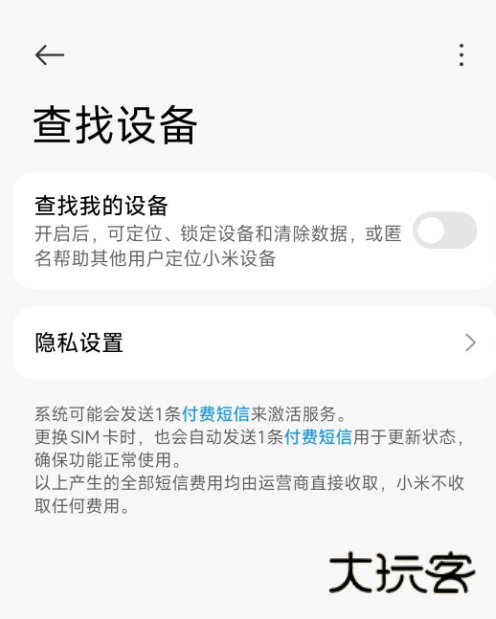3、点进去直接开启查找本机设备的功能,小米手机的话第一次还需要像运营商发送一条收费的验证短信,iPhone的话不需要。