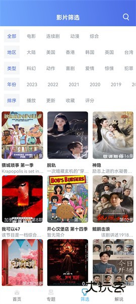 3、筛选栏目,就是影片晒选,用户可以根据影视类型、地区、年份等去筛选出自己感兴趣的影视资源,这样能够更加直观的查看自己喜欢的影视资源,搜索更加方便;