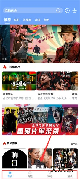 1、点击进入,在首页可以看见有专题/筛选/解说等栏目,首页有这种丰富的影视剧资源,电影、电视剧、动漫都能找到,用户可以直接在搜索栏输入目标名字进行搜索;
