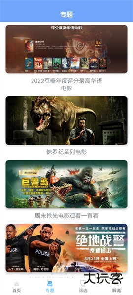 2、在专题栏目,可以看见各种不同专题的影视,例如侏罗纪系列电影、年度评分最高华语电影等不同的专题,方便大家查找自己喜欢的资源;