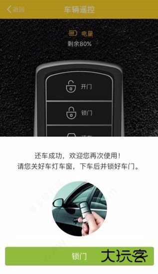 6、车辆使用完毕--停车到指定网点--关好门窗、拉起手刹、关闭灯光--选择【还车】按钮