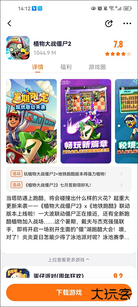 2、选中植物大战僵尸2,进入游戏介绍界面,这里有详细的攻略和游戏圈,随时都可开始游戏;