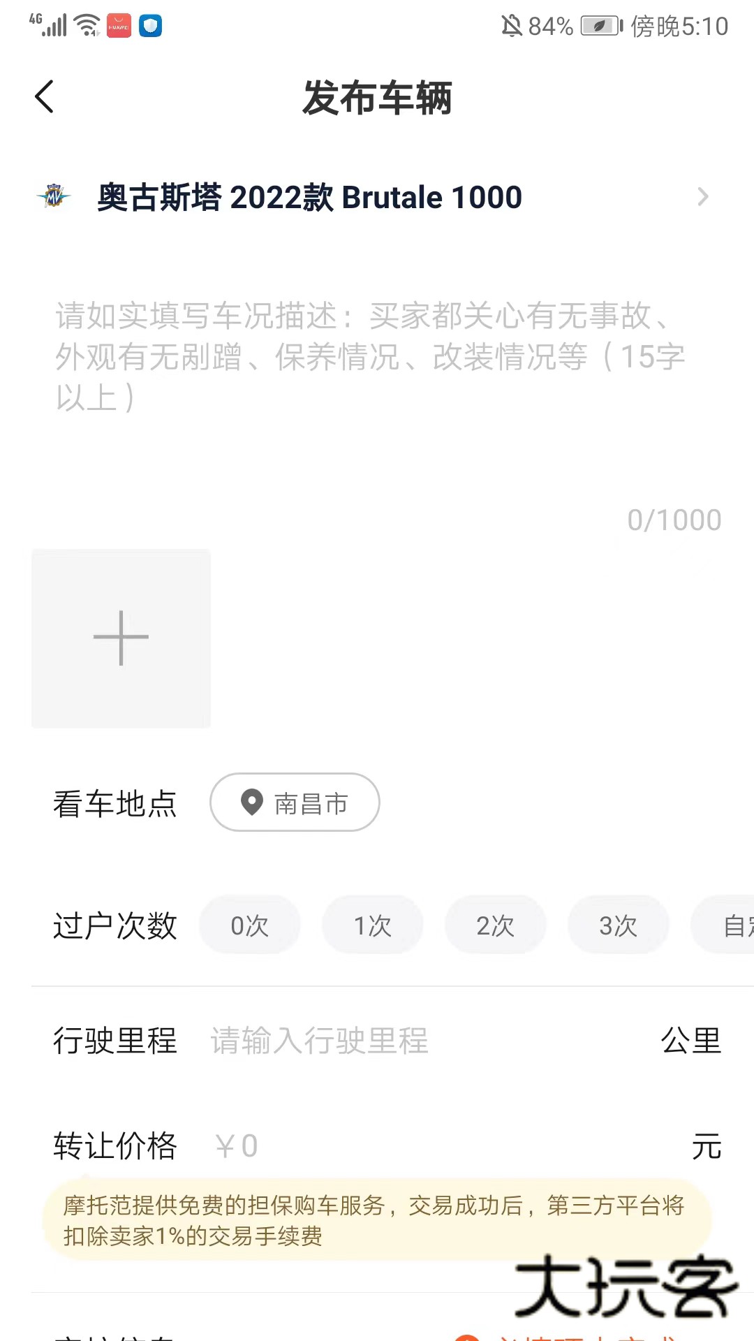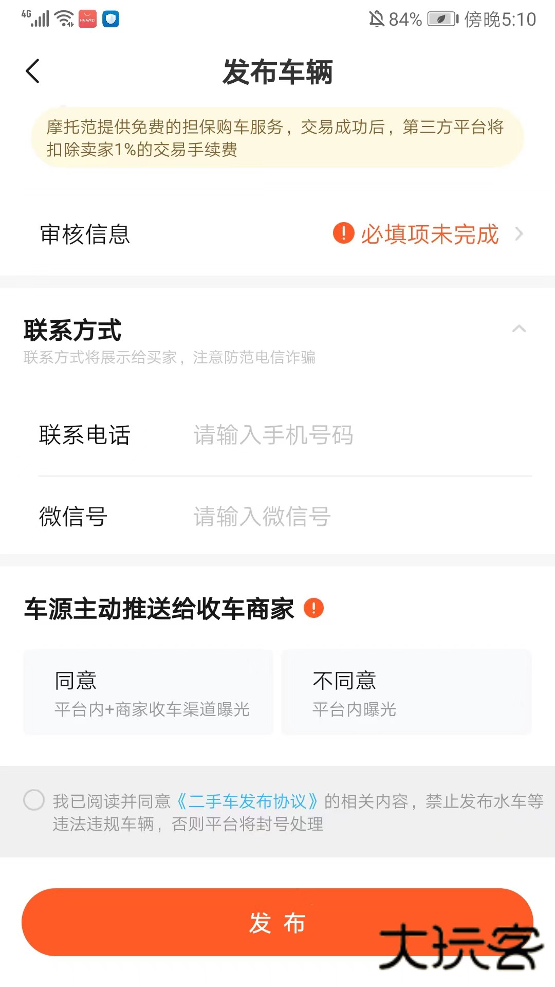 6、进入发布车辆界面,依次输入车况的相关描述、过户次数、行驶里程、转入价格以及联系方式后选择【发布】就可以卖车了。