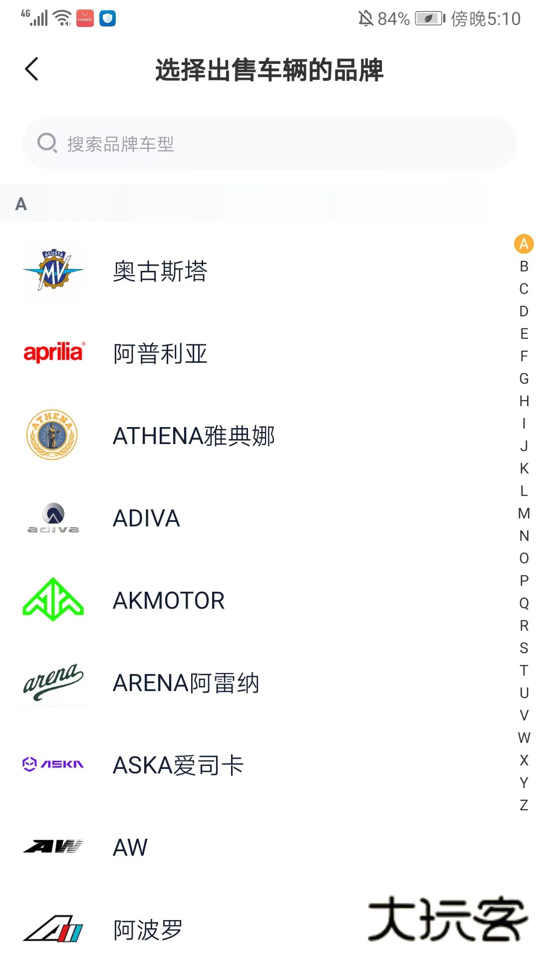 3、滑动屏幕可以浏览并选择出售车辆的品牌,也可以在上方搜索框搜索相应的品牌;