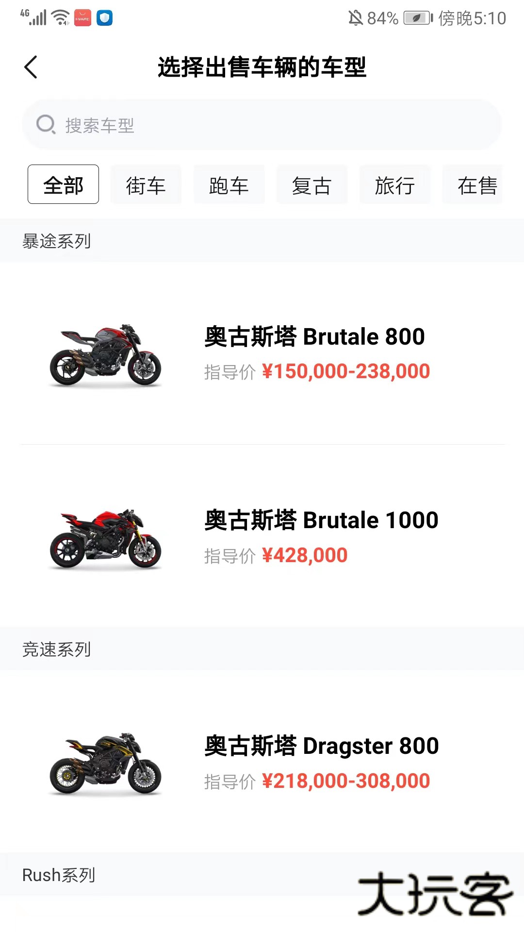 4、选择出售车辆的车型,包括街车、跑车、复古、旅行、在售等分类,也可以进行搜索;