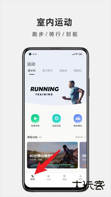 2、进入首页点击底部“运动”标签,可选择跑步机、健身车等模式开始锻炼。
