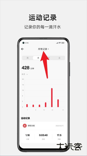 5、进入“运动记录”页面可按日、周、月查看累计运动时长及历史训练详情。