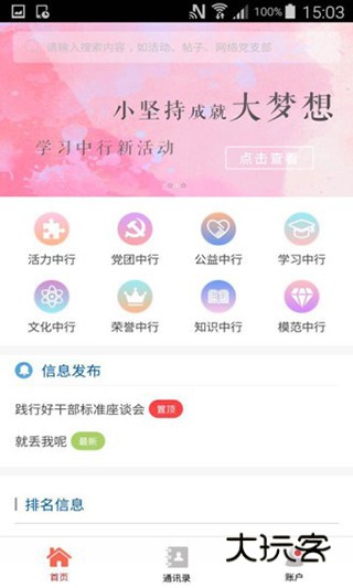 3、接着进入首页中则能轻松获取最新、最火的资讯信息,了解排名信息,以及快捷的查阅活动、公益、学习、文化和党团等内容