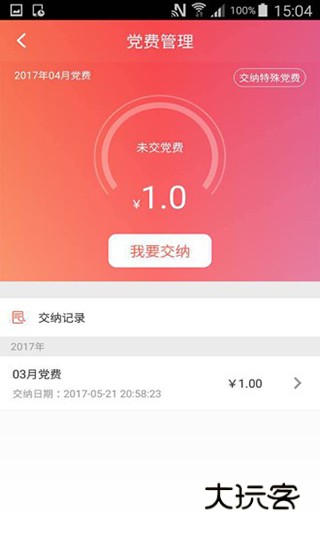 5、最后需要查阅、缴纳党费的话,点击首页中的团党进行按钮,进入党费管理页面,轻松查阅党费缴纳记录和一键缴纳党费等。