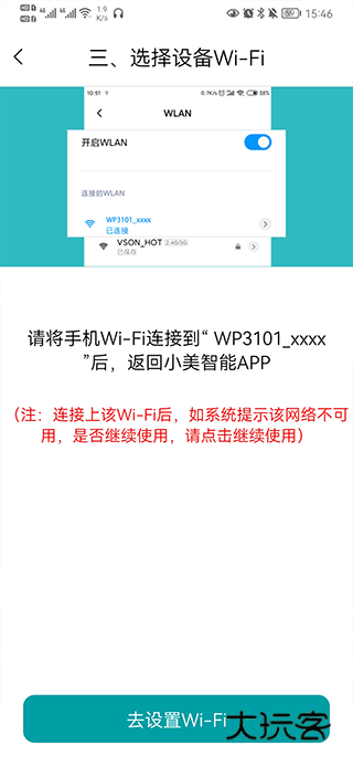 4、将手机WiFi连接到wp3101_xxxx后,就可以连接设备了。