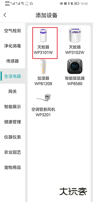 2、选择要添加的设备与型号,如灭蚊器 WP3101W;