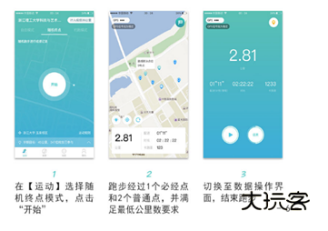 5、“随机终点”和“约定终点”两种跑步模式可随意选择,只要完成跑步任务,都计入成绩;开始跑步后――系统自动在校园内生成五个感应点位,请沿着感应点位的路线跑(点位没有顺序,可随便跑)――直至完成本次跑步任务,并保存成绩――此次跑步完成。