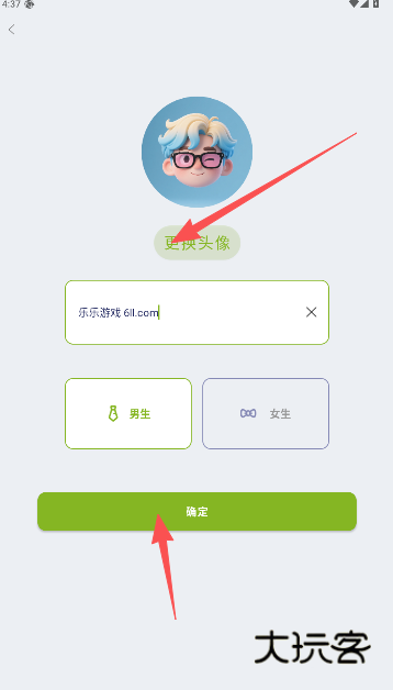 4、信息填写完整后,进入个人资料设置界面,选择头像、性别设置自己的用户名称确定保存。