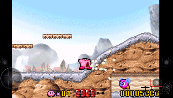 当卡比肚子鼓起时(比如悬浮中或刚吸气后),按 B 键则是吐气攻击,攻击范围相对较短。