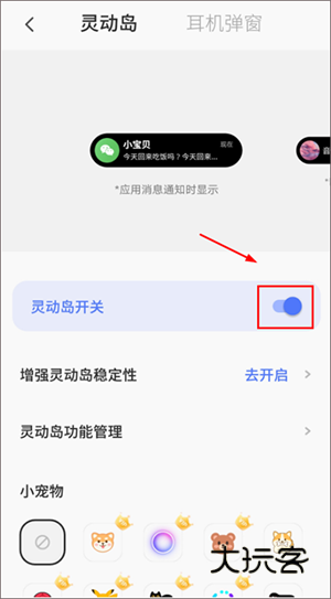 4、在【灵动岛】设置页面,向下滑动,还可以添加宠物,和修改其位置。