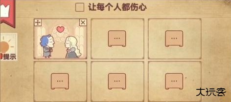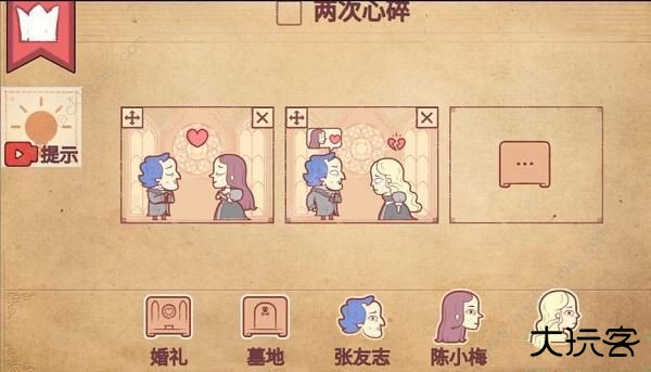 3、拿出 “墓地” 道具,拖进第三个虚线框。把 “张友志” 拖进这个墓地框,放到出现的墓碑里。之后把 “陈小梅” 拖进这同一个框。看到张友志已逝的场景,陈小梅心也碎了,再次达成目标