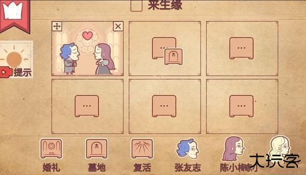 6、点击 “复活” 道具,拖到第四个虚线框里。把 “关淑慧” 拖进这个复活框。好啦,现在点一下 “墓地” 道具,把它拖进第五个虚线框。紧接着把 “关淑慧” 拖进这个新的墓地框。最后一步,把 “张友志” 拖到场景中显示的墓碑上放置。大功告成